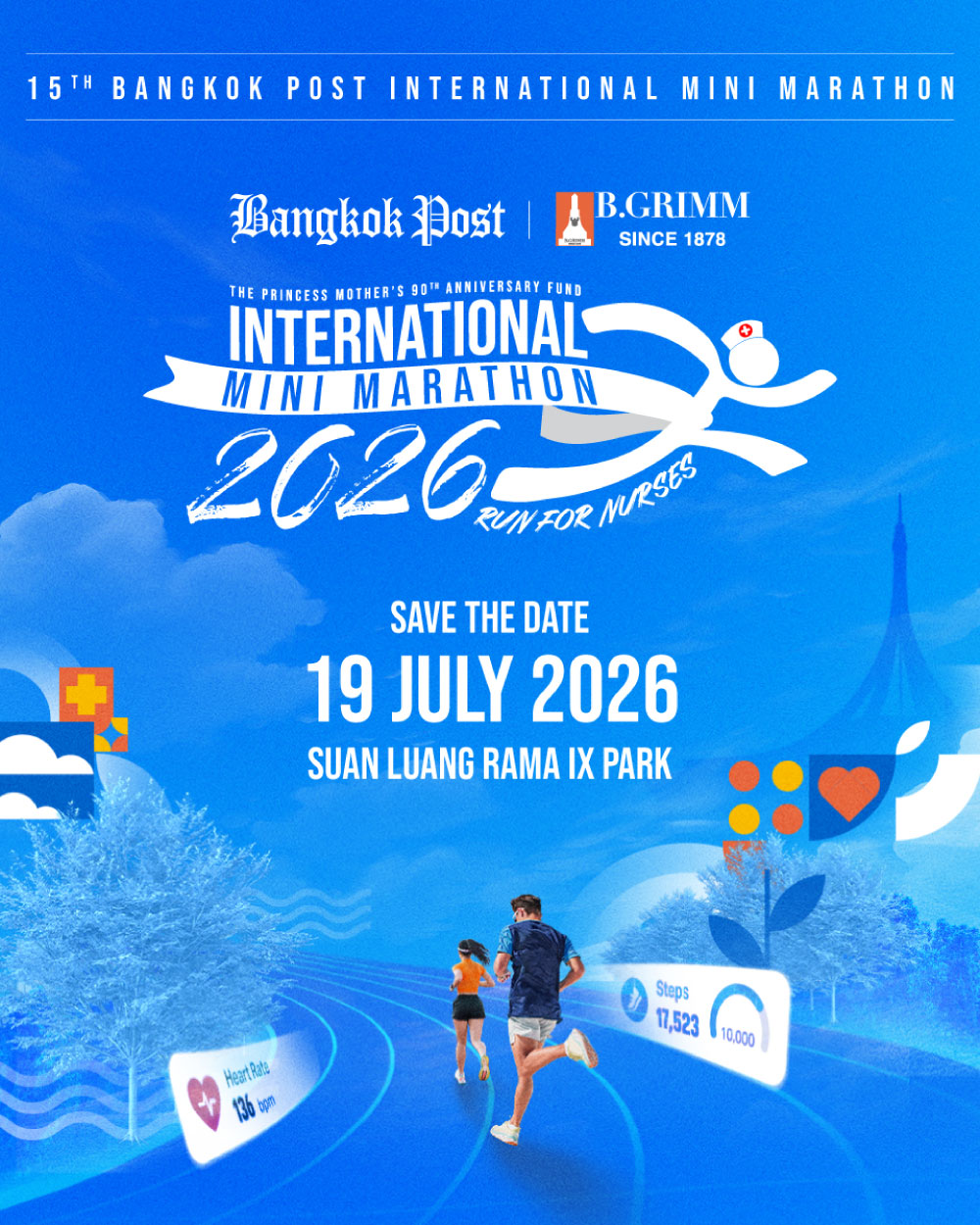 เนื่องในโอกาสครบรอบ 80 ปี ของหนังสือพิมพ์บางกอกโพสต์ บริษัท บางกอก โพสต์ จำกัด (มหาชน) ร่วมกับ บริษัท บี.กริม เพาเวอร์ จำกัด (มหาชน) กำหนดการจัดงานแข่งขัน เดิน-วิ่งเพื่อสุขภาพการกุศล Bangkok Post International Mini Marathon 2026: Run For Nurses (ครั้งที่15) ชิงถ้วยพระราชทาน สมเด็จพระกนิษฐาธิราชเจ้า กรมสมเด็จพระเทพรัตนราชสุดาฯ สยามบรมราชกุมารี ในวันอาทิตย์ที่ 19 กรกฎาคม 2569 เวลา 05.00 - 09.00 น. ณ สวนหลวง ร.9 กรุงเทพมหานคร